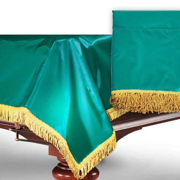 Мы предлагаем вам приобрести покрывало, предназначенное для бильярдного стола. Данное покрывало подойдет для бильярдного стола размеров в семь футов, а сделано оно из синтетического материала. Данный материал пропитан влагостойким веществом, это вещество позволяет отталкивать воду и не позволяет бильярдному столу намокнуть. Данный материал совершенно не пропускает пыль и грязь, поэтому ваш стол останется в полной сохранности. У покрывала классический зеленый цвет, который сразу же ассоциируется с бильярдной комнатой, такое покрывало прекрасно дополнит любое помещение, в котором стоит бильярдный стол. По краям покрывало украшено золотистой бахромой.