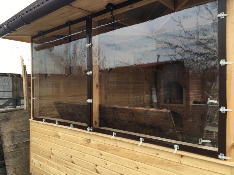 • С помощью прозрачных штор ПВХ зрительно увеличивается объем постройки, а на солнце она приятно блестит.
